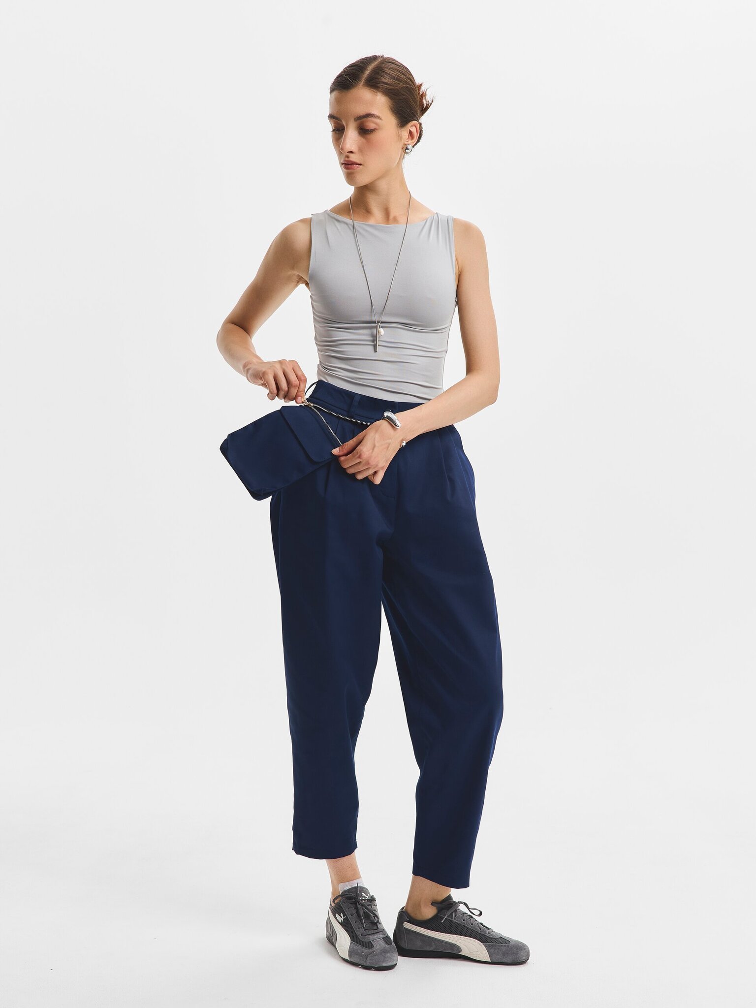 Брюки Волюмэ - новинка нашей хлопковой коллекции! Они выполнены из дышащего материала с хлопком в составе. Силуэт зауженный к низу, но свободный в районе бедер, что создает тот самый удобный деловой образ. И настоящая изюминка модели - наружный карман на молнии, который можно отстегивать от брюк.