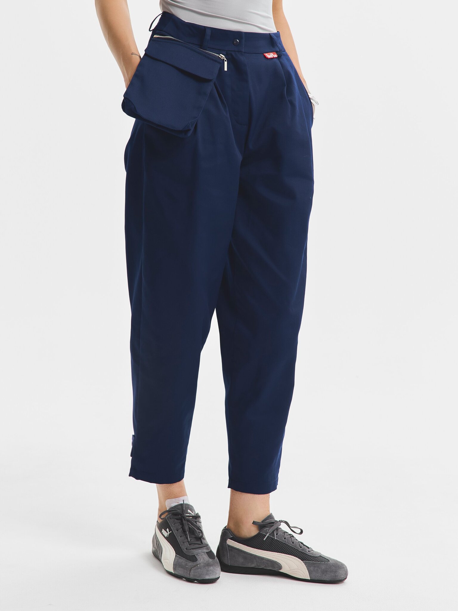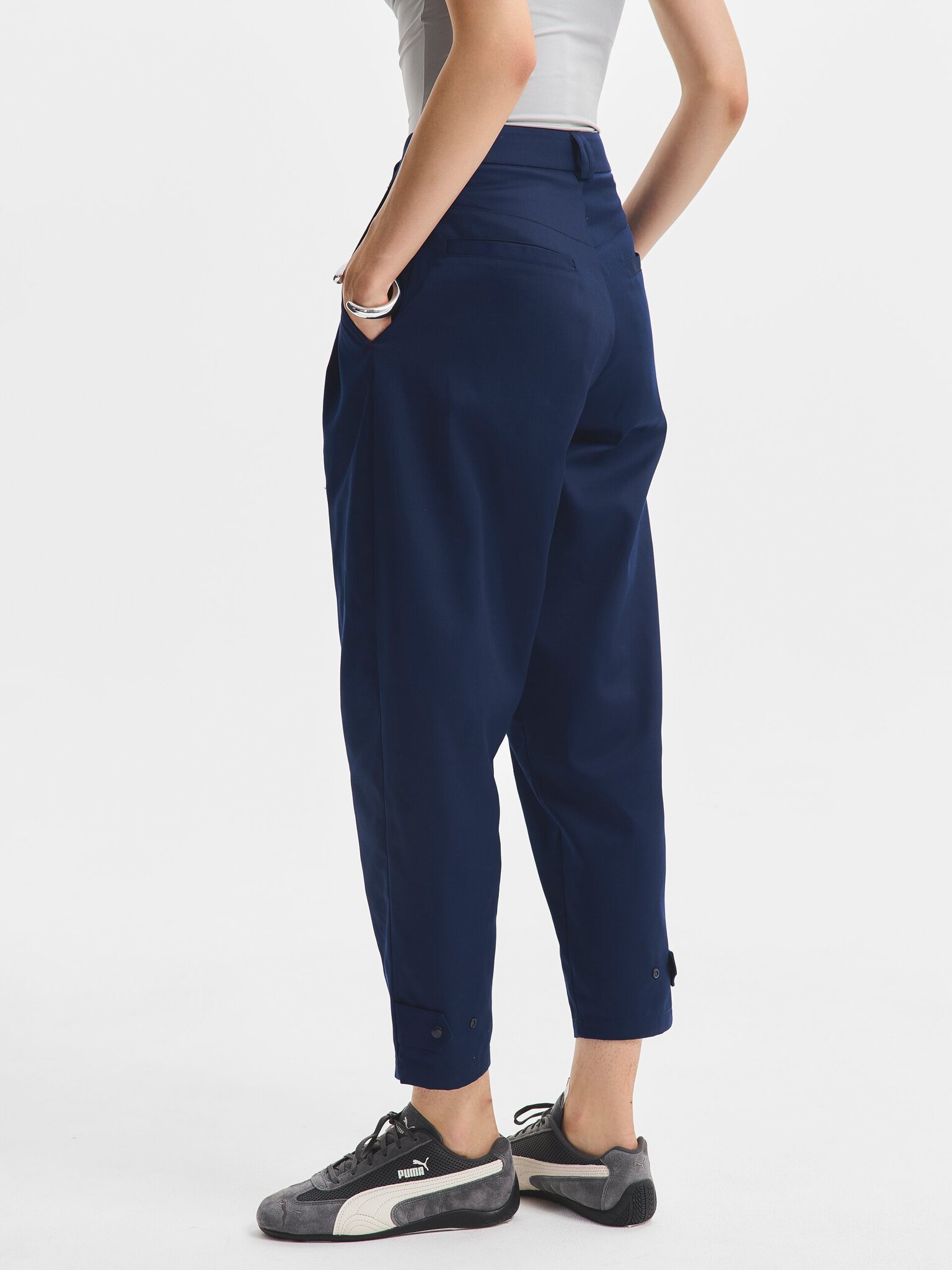 Функциональность дополняет карман на отстегивающейся молнии, который можно легко снять при необходимости. На задней части манжет предусмотрена застёжка на кнопке, позволяющая регулировать ширину и заужать брючины.