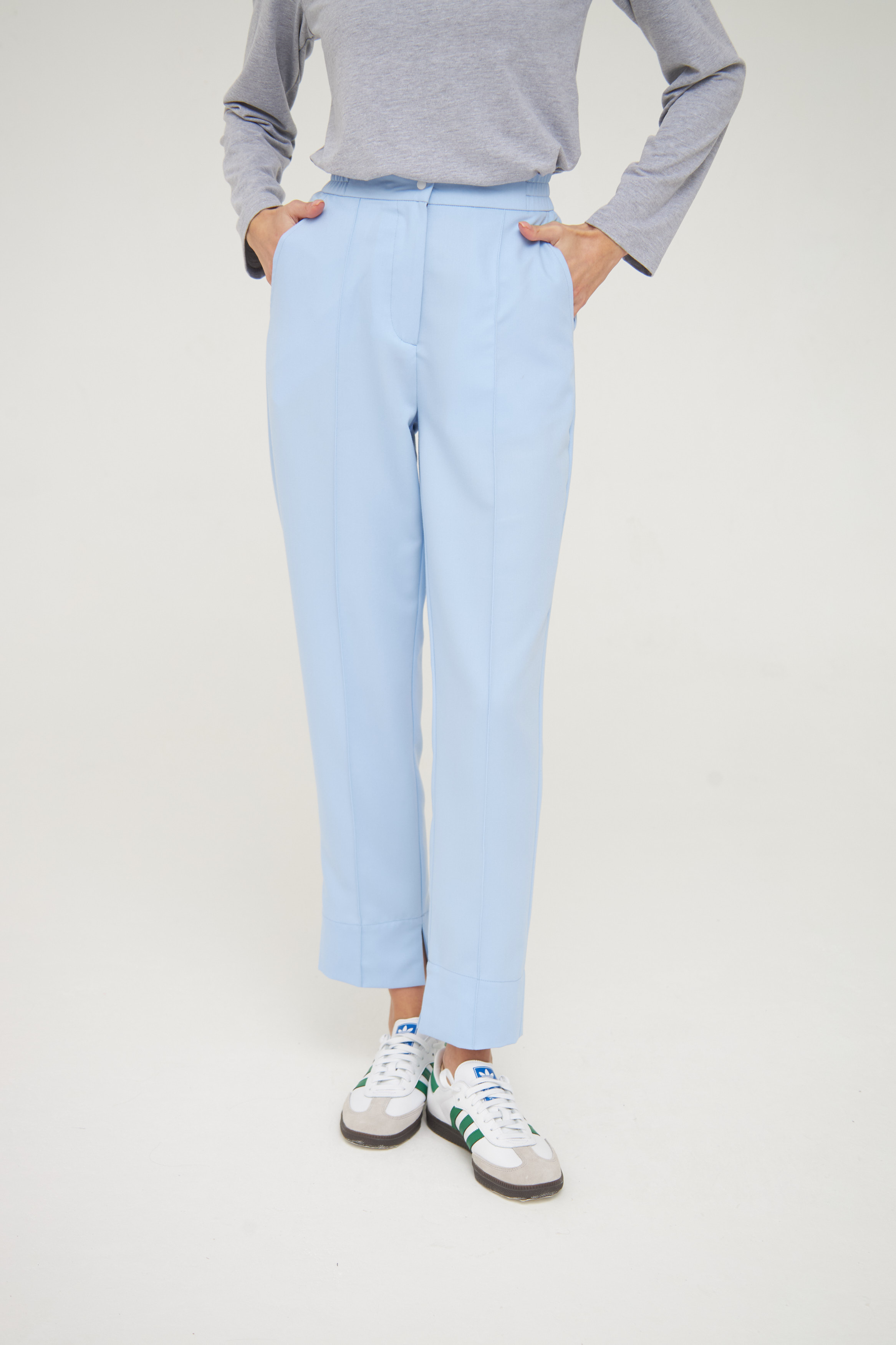 Стильный профессиональный образ достигается при помощи застроченной стрелки, которую не нужно заглаживать и классическому узкому фасону штанин.