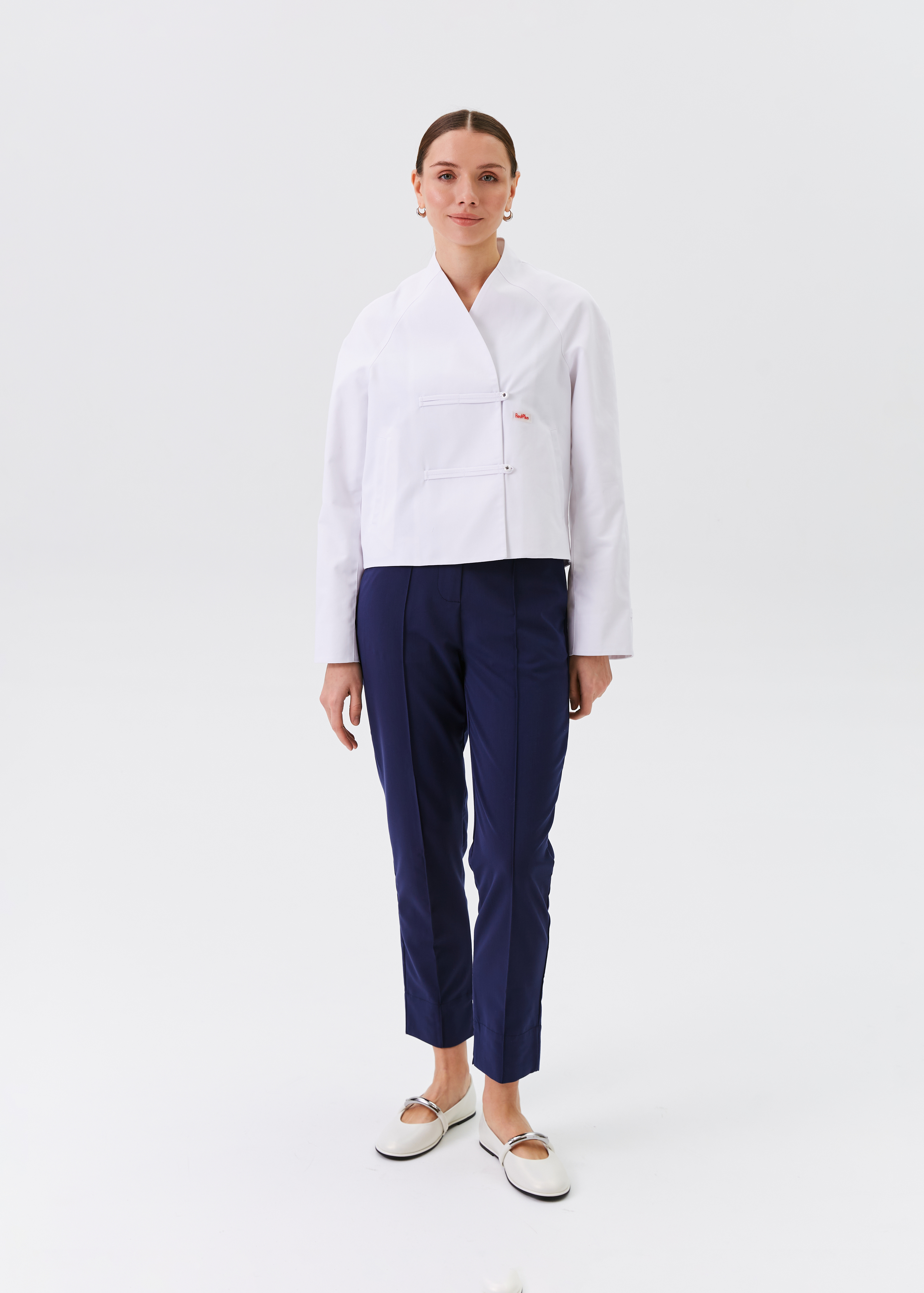Стильный профессиональный образ достигается при помощи застроченной стрелки, которую не нужно заглаживать, и узкому классическому фасону штанин.