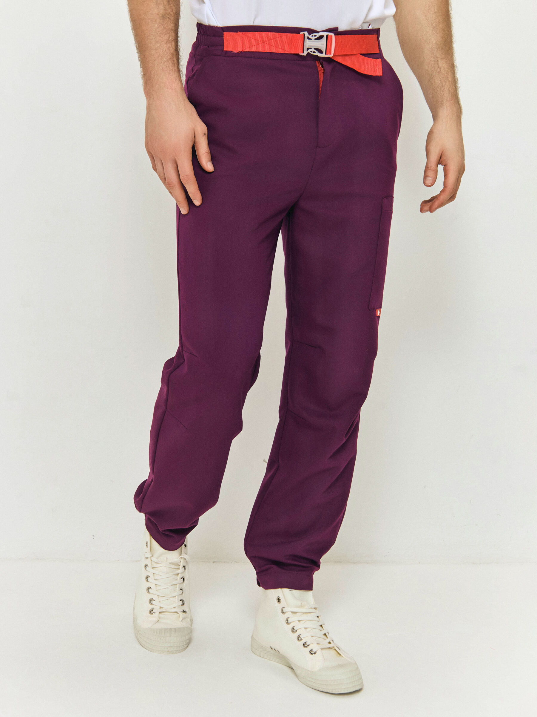 У брюк высокая посадка, на талии есть регулируемый пояс на застежке. Помимо накладного кармана на молнии на бедре, на брюках есть еще 4 глубоких кармана по бокам и сзади.