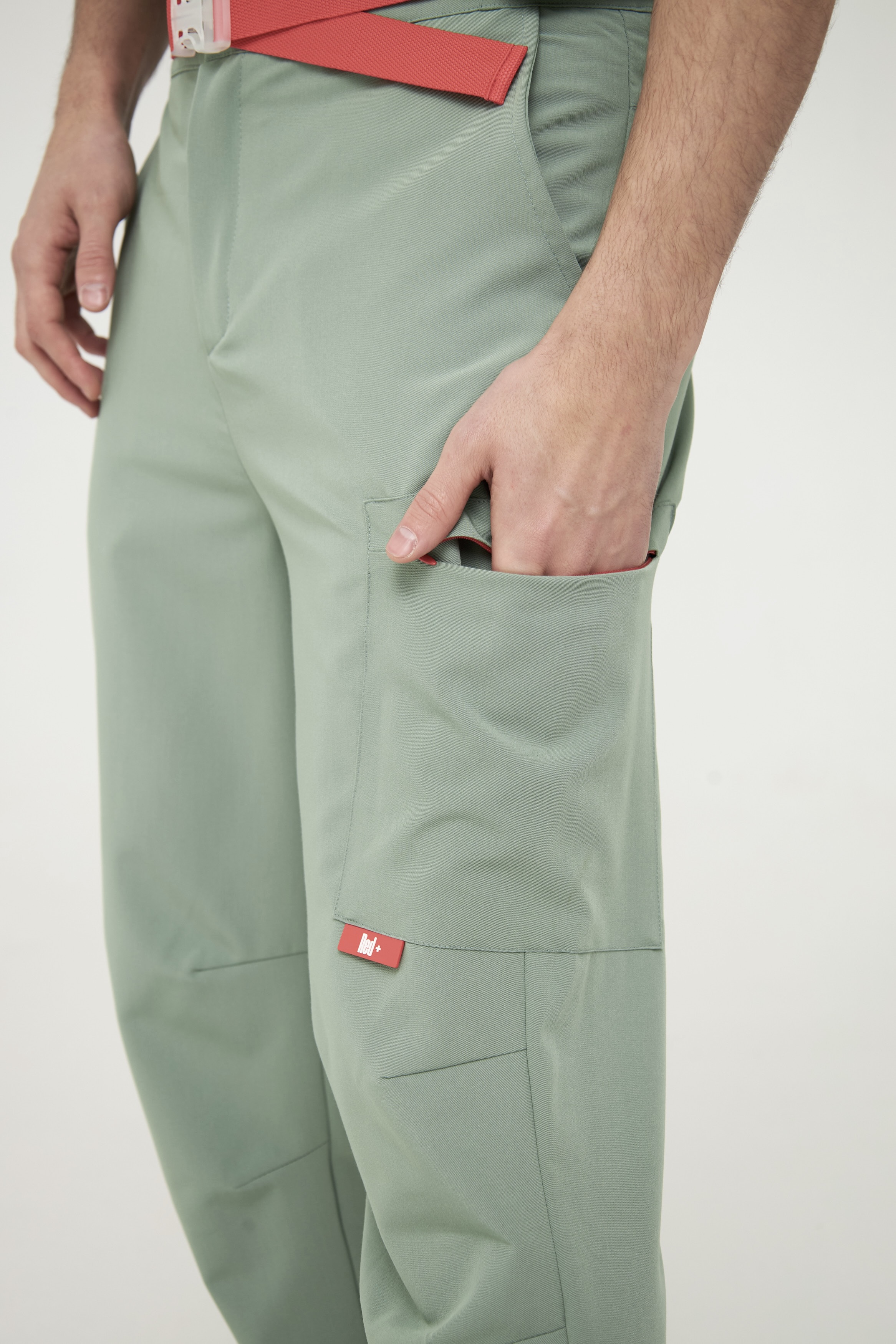 У брюк высокая посадка, на талии есть регулируемый пояс на застежке. Помимо накладного кармана на молнии на бедре, на брюках есть еще 4 глубоких кармана по бокам и сзади.
