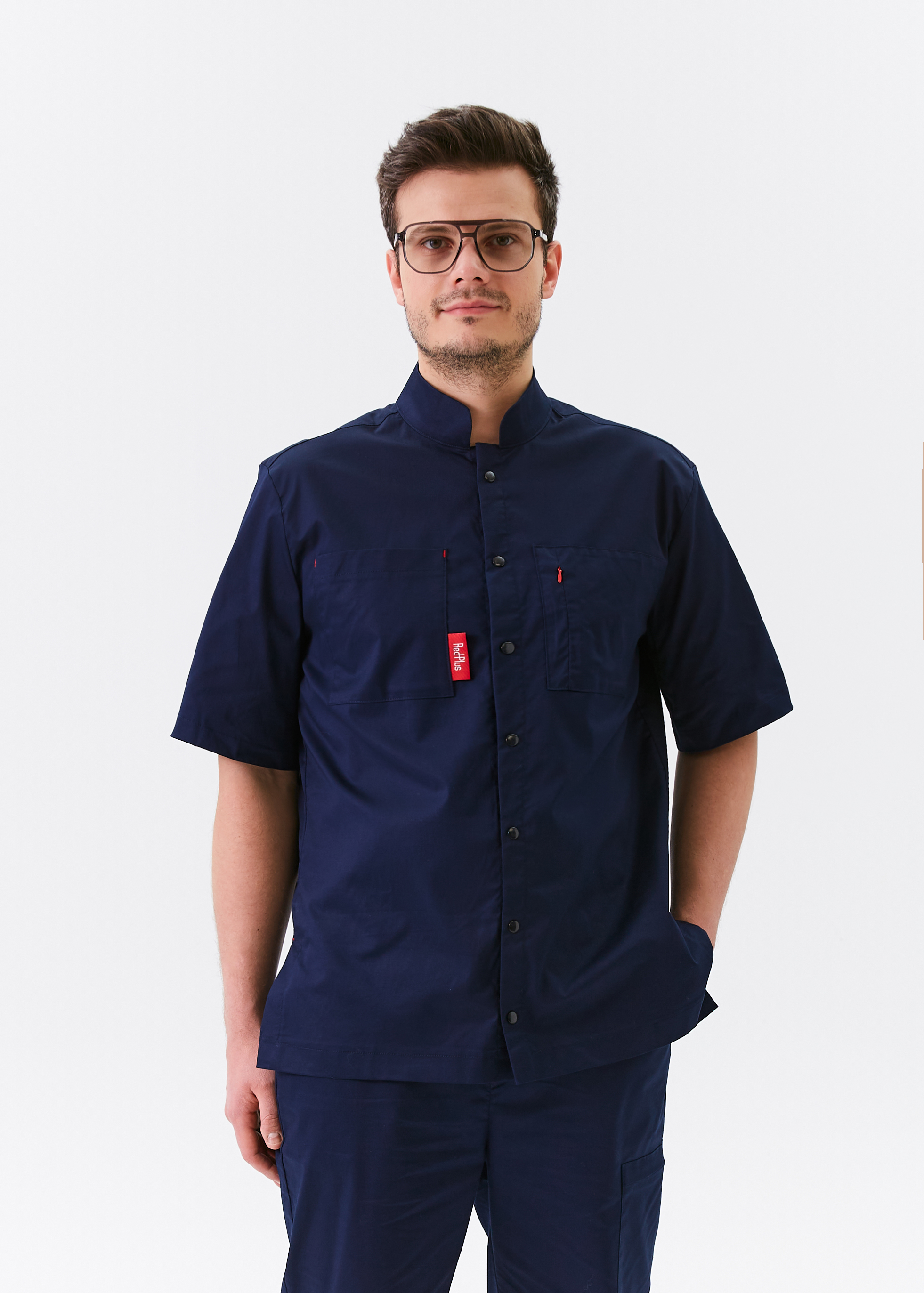 Унисекс рубашка на пуговицах; короткий рукав; воротник-стойка; модель дополнена двумя...