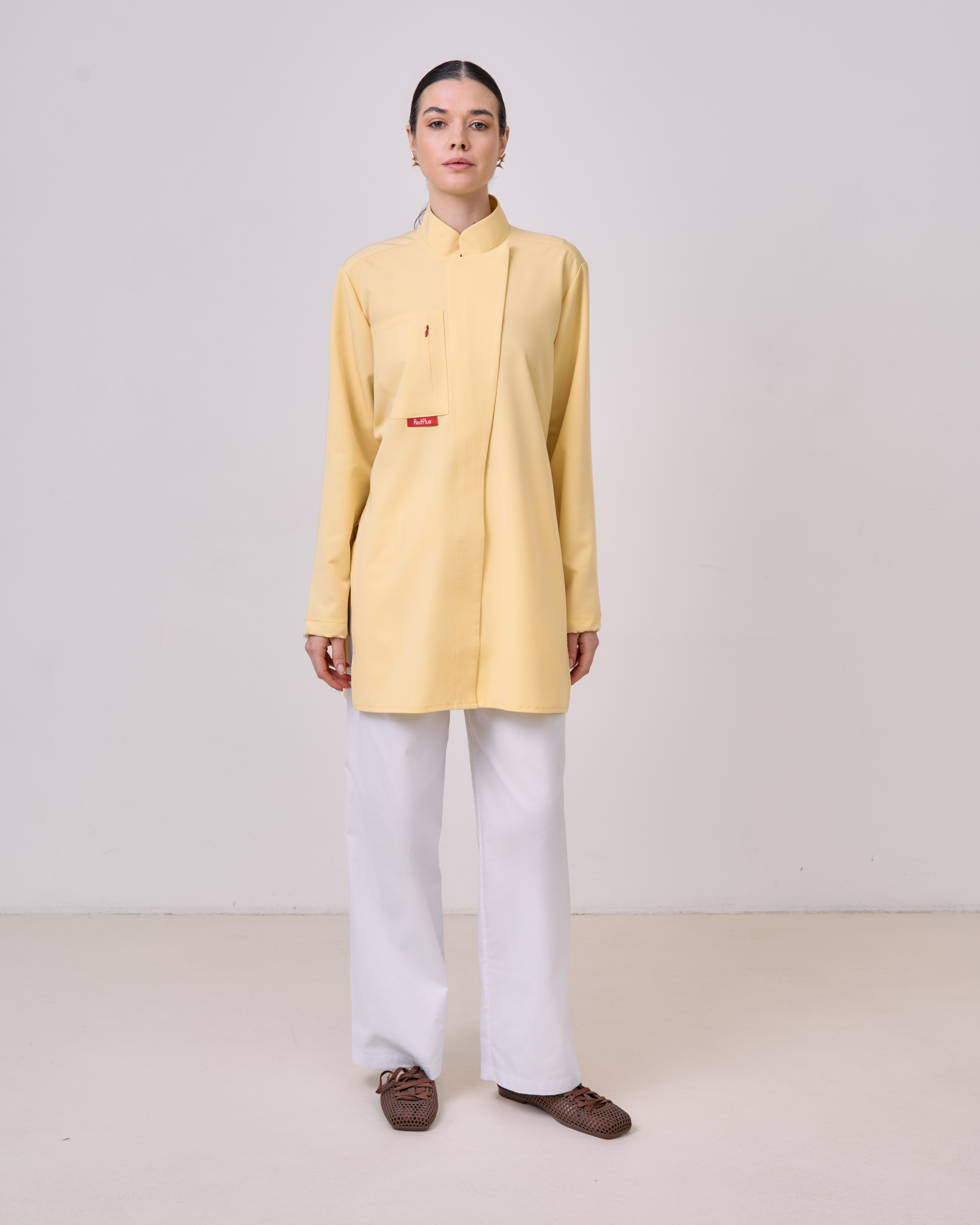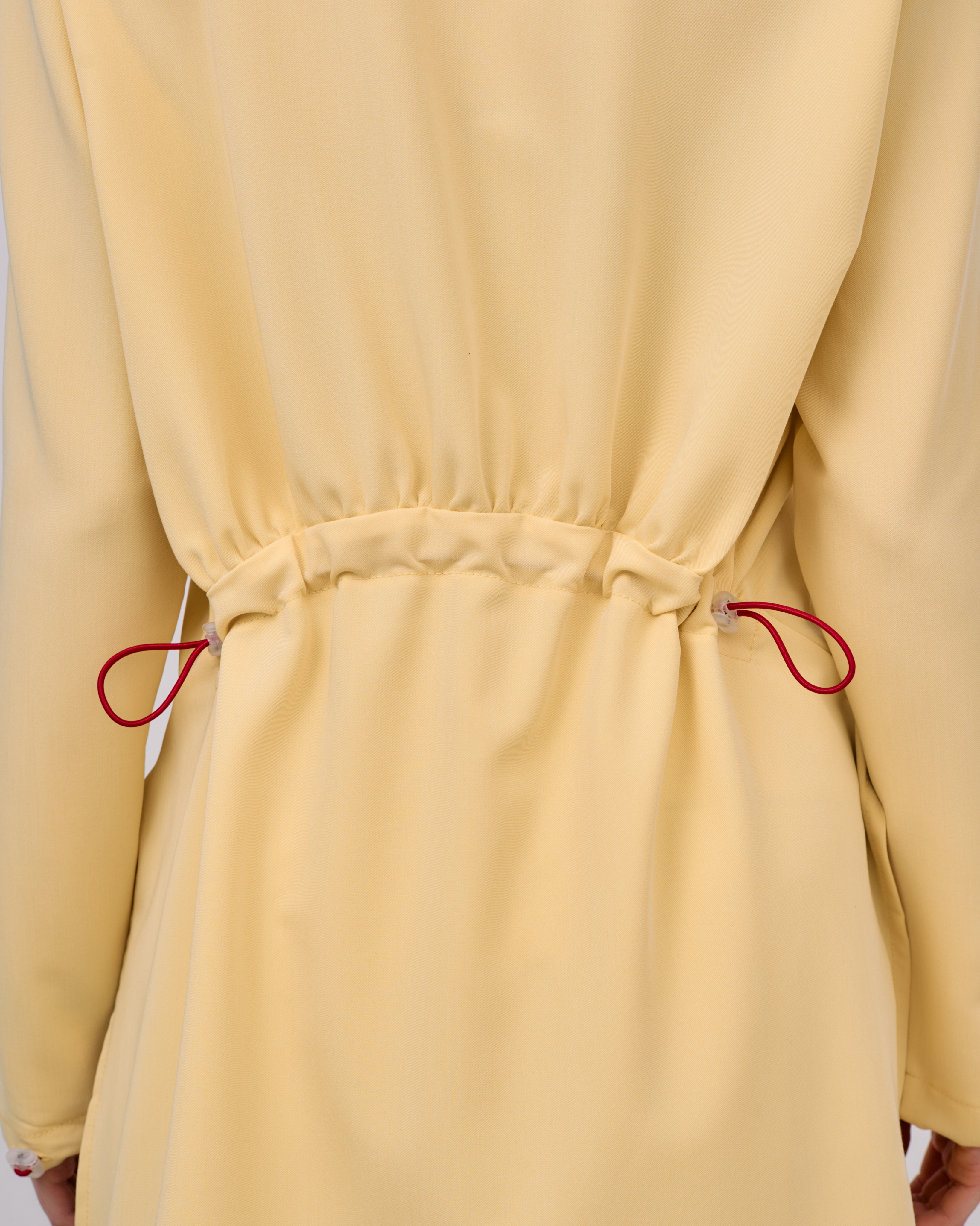 Удлиненная свободная блуза с воротником стойкой и регулирующимся на спинке объемом. Рукава полной длины также имеют кулиску для фиксации рукава на нужном уровне.