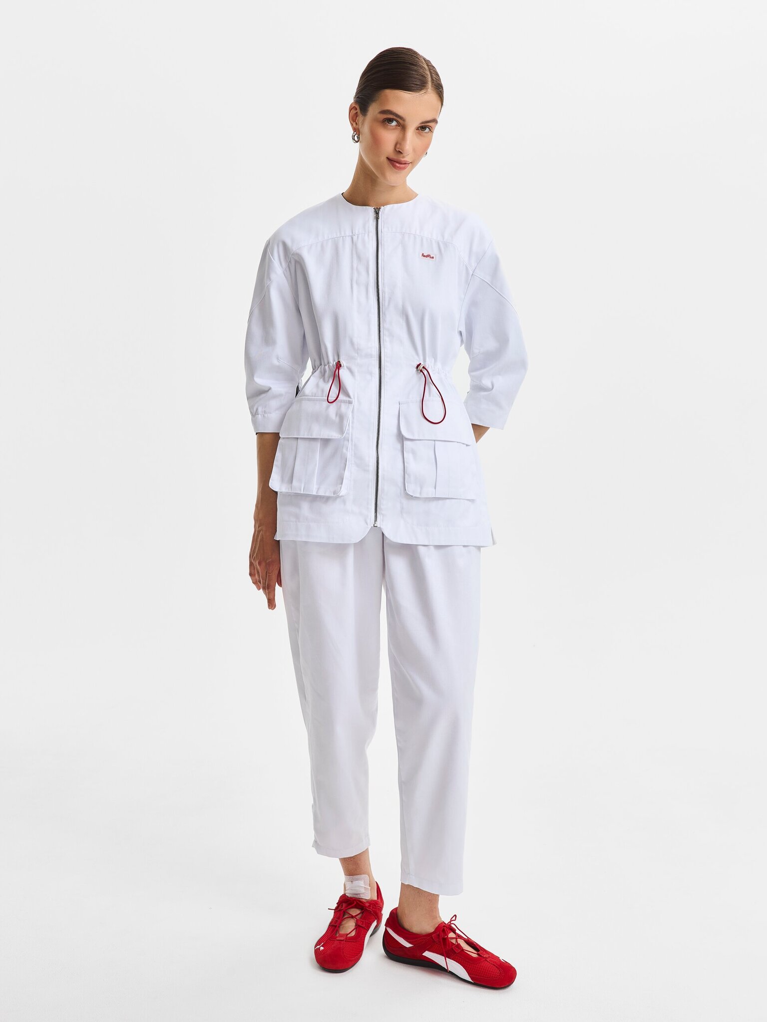 Жакет выполнен из плотного хлопка — ткань дышит, отлично держит форму и легко переносит частые стирки на высокой температуре. За счёт контрастной кулиски можно регулировать посадку по талии, подчёркивая силуэт. Длина чуть ниже бедра визуально вытягивает фигуру, а рукав ¾ открывает запястье — практично и элегантно одновременно. При этом сам рукав имеет актуальную скругленную форму и дополнен потайной молнией для расширения.