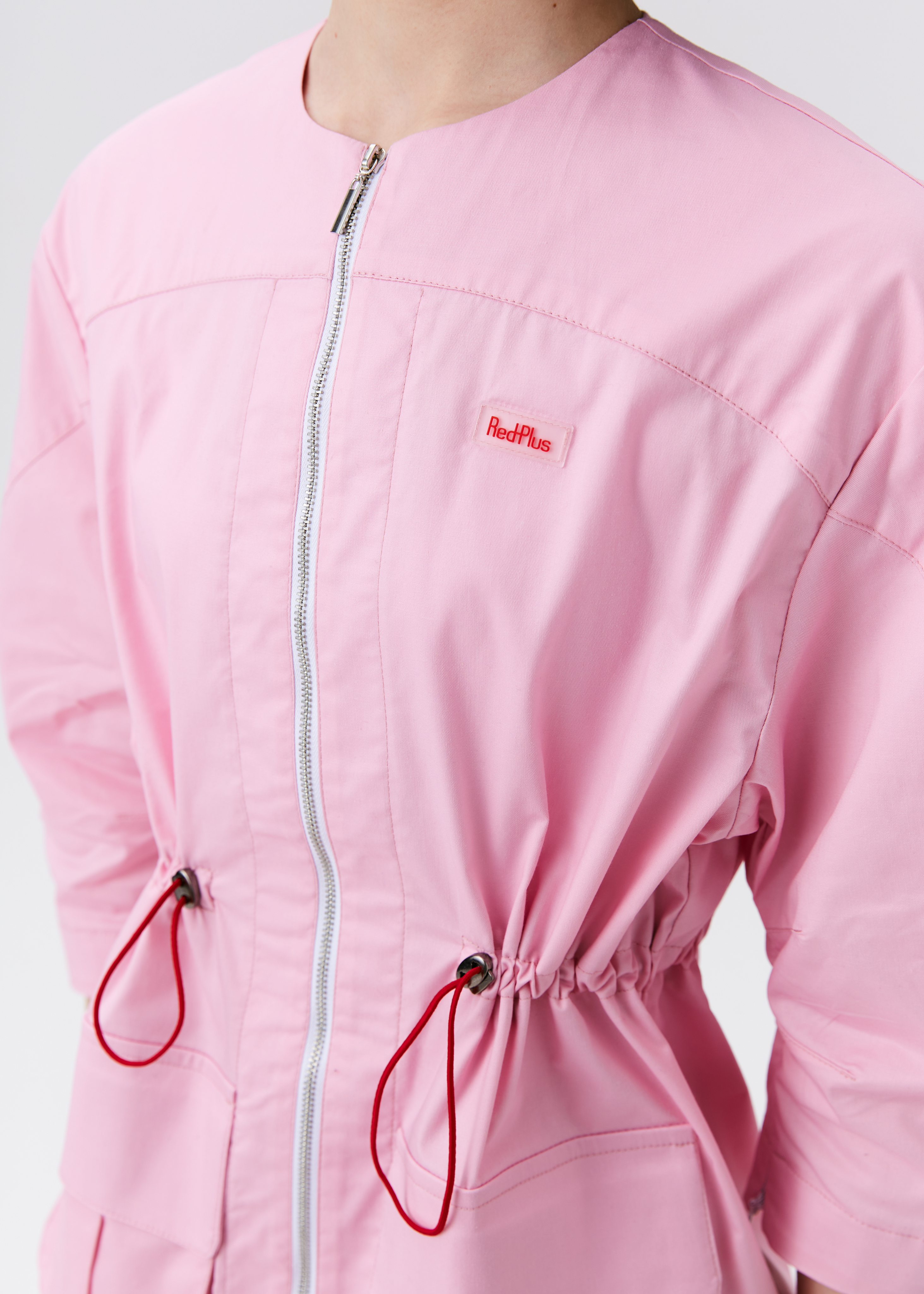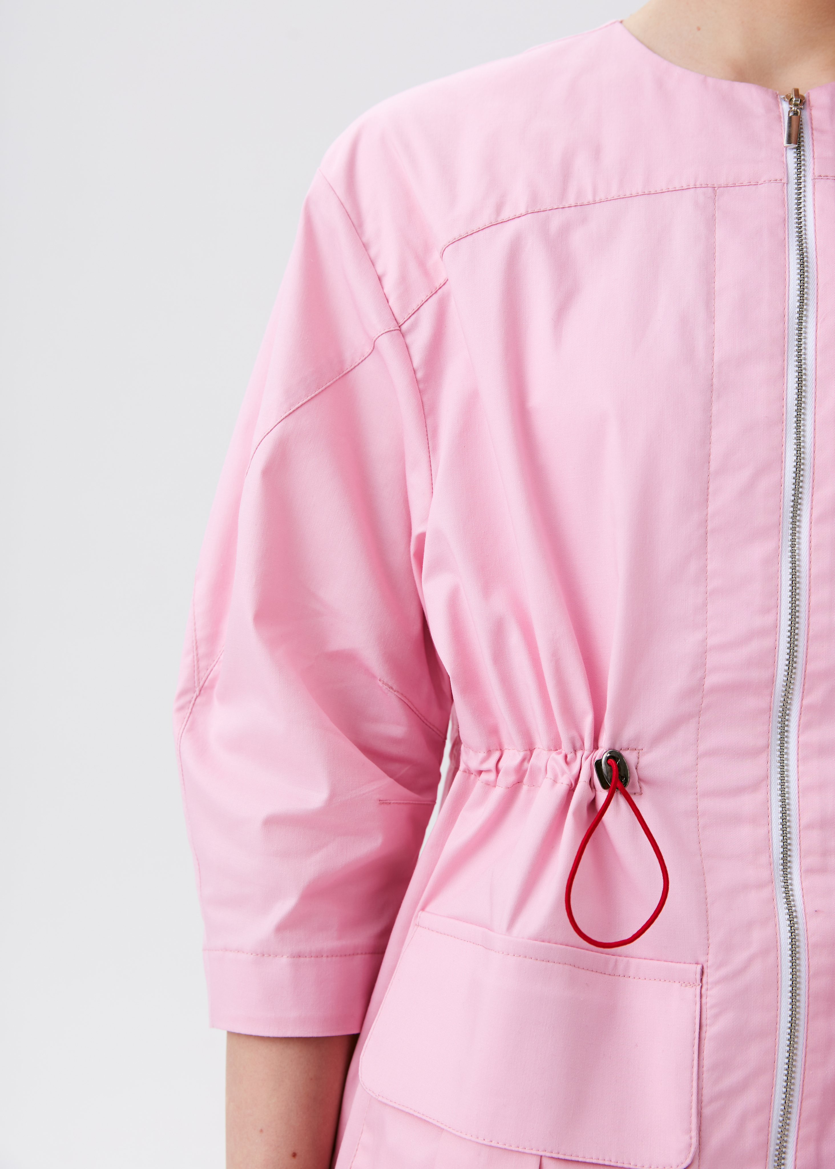 Жакет выполнен из плотного хлопка — ткань дышит, отлично держит форму и легко переносит частые стирки на высокой температуре. За счёт контрастной кулиски можно регулировать посадку по талии, подчёркивая силуэт. Длина чуть ниже бедра визуально вытягивает фигуру, а рукав ¾ открывает запястье — практично и элегантно одновременно. При этом сам рукав имеет актуальную скругленную форму и дополнен потайной молнией для расширения.